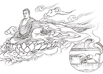 十一、梦随弥陀,游十方界 僧济则暂时卧在床上休息。接着就梦见自己秉持一支蜡烛,凌空而行,阿弥陀佛将他接引安置于阿弥陀佛的手掌之中,遍至十方世界。然后突然醒过来,僧济满心喜悦地说:“我只以一夜的时间观想忆念,便蒙阿弥陀佛接引。”并明白色身是四大假合,病苦也消失了。