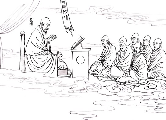 七、入白莲社,念佛往生 自从入了庐山莲社之后,即专一心志忆佛念佛,东晋安帝义熙十四年(公元四一八年),端坐合掌,高声念佛,正念往生。