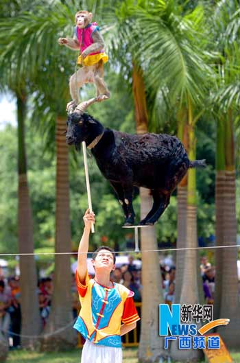 山羊和猴子联袂表演走钢丝(图片来源:新华网 摄影:周华) 在从母猴身边夺走的过程中,幼猴经常会受伤或者死亡,而这种情况每年都会在亚洲乃至世界各地上演,仅印度尼西亚就有3000只猕猴遭遇这样的悲惨命运。它们终生被短绳束缚,或被拴在杆子上,或被关在狭小的笼子里。表演期间,它们每天被迫在刺耳的音乐中重复着各种难堪的动作。许多猕猴在残忍严酷的跳舞、“弹”吉他或者骑自行车等训练中死去。 |