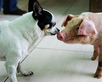 它们都是我们的朋友,我们没有权利吃它 狗是我们的好朋友,但猪不是? 现在家中养宠物的很多,在养狗的人看来,狗是人类的朋友,吃狗肉是不可思议的,自己不屑与那些吃狗肉的人交往。的确,狗是很有灵性的动物,对主人非常忠诚,新的研究发现狗有类似人类的同情心等那种复杂的情感,可以和人进行情感交流。但是,养狗的人虽然痛斥吃狗肉的人野蛮、缺乏爱心,对自己吃猪肉的行为却认为是正当的,从古以来都是如此的。那么,猪真的是我们的食物吗?我们爱狗是没有错,但是为什么猪会沦为被吃的地步? 狗和猪的天壤之别的地位差别是怎样形成的? 让我们看看历史。 早期人类在长期狩猎的劳动实践中发现,为了补充食物可以将一些幼小的野生动物带回家中饲养,逐渐地其中有一些动物被驯化成家畜,从而出现了原始畜牧业。狗、山羊最早被驯化,其次是猪、牛、驴、马,再后来是火鸡、鸡。也有一些考古发现说猪的被驯化甚至更早于狗,在距今约7000年至6000年前的河姆渡遗址中,就有大量的家猪化石出土。不管如何,猪和狗都是最早被驯化的动物,也可以说它们和人类特别有缘吧。 原始畜牧业饲养动物的一个重要目的就是补充原始农业的不足,提供食物。现在看起来,一个动物需要符合几个条件,才适合被饲养。一是这个动物不能野性很大,难以驯服。狼和熊等就不符合这条件;二是这个动物必须是个杂食动物或者食草动物,一切肉食动物都不符合条件。因为饲养动物的目的是获得肉食,如果这个动物本身要食肉,是供养不起的。三是这个动物的个头要不大不小,个头太大对人形成威胁,个头太小不能提供足够的肉量,例如老鼠就太小。四是这个动物的繁殖力要强,几年生一胎或者更少就不合适。马、牛、羊、猪、狗、鸡在古代被称为六畜,就都符合以上的各种条件。这就是说:在原始畜牧业时期,饲养动物是以提供食物为主要目的,在那时候,狗和猪的命运和职能还没有分化。 后来,人们在实践中逐渐发现:在当时的条件下,这六畜中马、牛、狗都对生产和生活更为有用,例如狗可以看家,帮助主人放牧和狩猎;而羊、猪、鸡相对用处较少,就逐渐沦为食物的地位。有了分工以后,猪就越来越缺乏与与主人沟通交流的机会,而人们为了心安理得地吃猪肉,把一些‘懒惰’、‘愚蠢’、‘肮脏’等恶名加到猪的头上。其实,在刚被驯化时,猪和狗并没有太大的区别的。猪的悲剧是如果野性大一些如狼一样,还可以继续在野外生活,过着自由的生活,归顺了人以后,却又嫌它用处不大而被当作食物。 现在时代不同了,生产力大大发展,人类不再需要畜牧业来补充食物,现代农业可以供应远比肉类营养更丰富,更合理的食品了。另一方面,狗也不再需要去看家、放牧和狩猎,异化成了家庭中的宠物和家庭成员。但是,由于历史的原因,猪的食物地位却还没有改变。看了上面的介绍可以知道狗作宠物,猪当食物并非历来如此,反而是现在这些吃猪肉的人没有与时俱进啊。为什么如此说?因为,对这些人来说,几千年来加在猪身上的偏见还没有消除。让我们为猪正名吧!最新的科研证明:猪比狗还聪明,训兽员教猪和狗开门,猪只看了5遍就会开门了,而狗学了10遍之后才学会。猪的嗅觉也比狗灵敏,有些机场已经在用猪来检查暗藏的武器和毒品了。猪比狗还爱干净,现在新的时尚是养宠物猪,养过的人都可以证明这点。