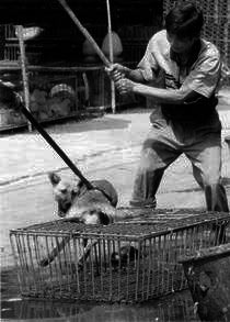 一下,两下……。 这是广州这家动物市场里的屠狗过程:选定一只狗,将它的脖子用火钳牢牢夹住,从笼子里拖出来,这时狗挣扎、狂吠,而刽子手用木棒向狗的头部狠击,一下、两下……躺倒的狗被割喉放血,有的狗这时仍在抽搐。血流尽之后,狗被扔进滚水翻腾的大锅褪毛。 据统计,手工屠宰方式在我国还占总屠宰量的60%以上,市场肉类供应中机械化屠宰率不到40%。 据一名参观过广州某家机械生产流水线的屠宰场的兽医描述,那里的动物同样是没有经过电击而直接死于屠刀之下。另外一名从业人员说一些大型的屠宰场采用电击,则完全是为了方便割喉放血那一环操作,提高生产效率。 后者同时也是广州市宠物协会的理事,他认为因为猪、牛、羊属于生产性动物,其主要用途与猫、狗等宠物类动物有别,所以屠宰最重要的是要卫生安全,严格检疫,防止传染病。是否采取人道的屠宰方法并不十分重要。 我国到现在还没有形成《屠宰法》。全国性的屠宰管理办法只有《生猪屠宰管理条例》,但主要是关于生猪屠宰管理以及保证生猪产品质量的规定,只有第十条提到屠宰要符合国家规定的操作规程和技术要求,或可与动物死亡时候的痛苦程度有关,但这“操作规程和技术要求”具体是什么却没有进一步规定。 近几年,有人大代表呼吁出台《屠宰法》,但针对的是私屠滥宰、病死畜禽出售、注水肉上市等市场管理问题;政协十届全国委员会第一次会议提出了《关于尽快制定畜禽屠宰法与国际接轨》的提案,原因是为了避免动物福利贸易壁垒对中国农产品出口贸易造成影响,也并非出于减轻动物死亡时候的痛苦。 有人或许认为,减轻动物痛苦的呼吁只是无聊的多愁善感,那么他实在应该参观一下我们的动物集市,他会怵目惊心——而我们能看到的动物痛苦,也许仍只是真实的冰山一角。