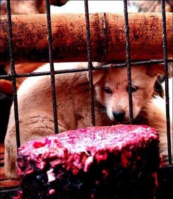 目睹同类惨遭屠戮,它们的眼神除了惊恐,还有凄凉,更是饱含无声的控诉。 屠宰场没有另辟隐蔽的地点,而是各自分散在某个摊位。左右对面为其他档口,所以宰杀可以公开让人观看。在旁的动物也能目睹同类遭戮的场面。 野生动物的屠宰并没有检疫人员在场。工具亦十分简单:刀与棍棒,水,胶盆,大铁锅。如果宰得多,就先扔地上,排队烫毛。动物的血流到地上,与臭污水汇在一起,3~4只躺在血泊中等候处理的羊、狗皮毛上面,群蝇乱舞。 据记者所知,在英国,屠杀业是受人道屠宰法严格管制的。美国也在1958年通过联邦人道屠宰法,其中反对使用古老而野蛮的屠牛斧。按照发达国家的人道屠杀法案,动物应先用电流或电击棒击昏,然后在恢复意识之前割断喉咙。法律还要求必须由技术熟稔的人运用适当的器材来做这项工作。这样是为了让死亡快而无痛。 实际上,电击也不能完全免除死亡的痛苦。美国苏利大学生理学讲师兼使用神经生物学联合实验所所长哈洛德·希尔曼博士说,遭受电击的人,无论是意外触电还是因精神疾病而接受电击疗法,都会感到很痛。现在的电击疗法普遍都是先麻醉再实施。 但也比没有经过昏迷处理要好。这里的动物却没有经过任何减轻痛苦的处理,被宰杀之前经客人挑出后,马上被拉到屠宰场,在神智完全清醒的状态下接受刀锋。