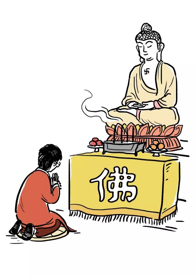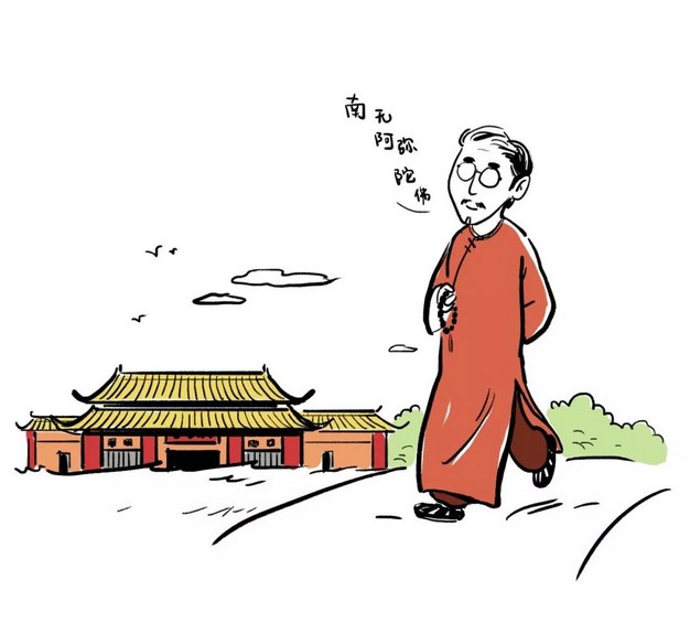 ⒊有一天,他念着念着佛,忽然想去外面转转,于是到了门外大殿。