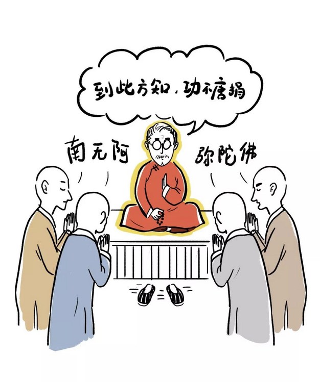 ⒏到了临终前三天,他只是感觉一身疲乏,四肢无力,但饮食一如平常,毫无痛苦,心中非常清醒,请寺院僧人轮班助念。走前他从床上坐起,和颜喜悦地对大众说:“到此方知,功不唐捐!”话说完之后,当下念佛坐化往生。
